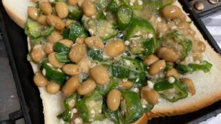 ネバネバのホットサンドオクラ納豆をパンの上にのせて、やいてほうばる具がこぼれないように食べるのが大変でした。